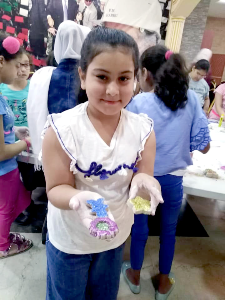 وفي نادي الطبخ قُمن بتزيين الكيك بالشوكولا والمارشميلو اللذيذ. كما صنعن وجه المهرج والأشكال من المعجون في نادي الفنون.