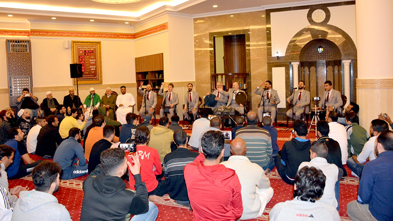 ثمّ تلا القارئ محمد أبو عمو آيات من القرآن الكريم، قبل أن تبدأ الفرقة بوصلاتها الإنشادية.