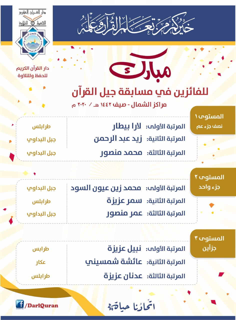 أقامت دار القرآن الكريم مسابقة قرآنية لطلاب “دورة جيل القرآن” الصيفية في مراكز الشمال ضمن مستويات ست.