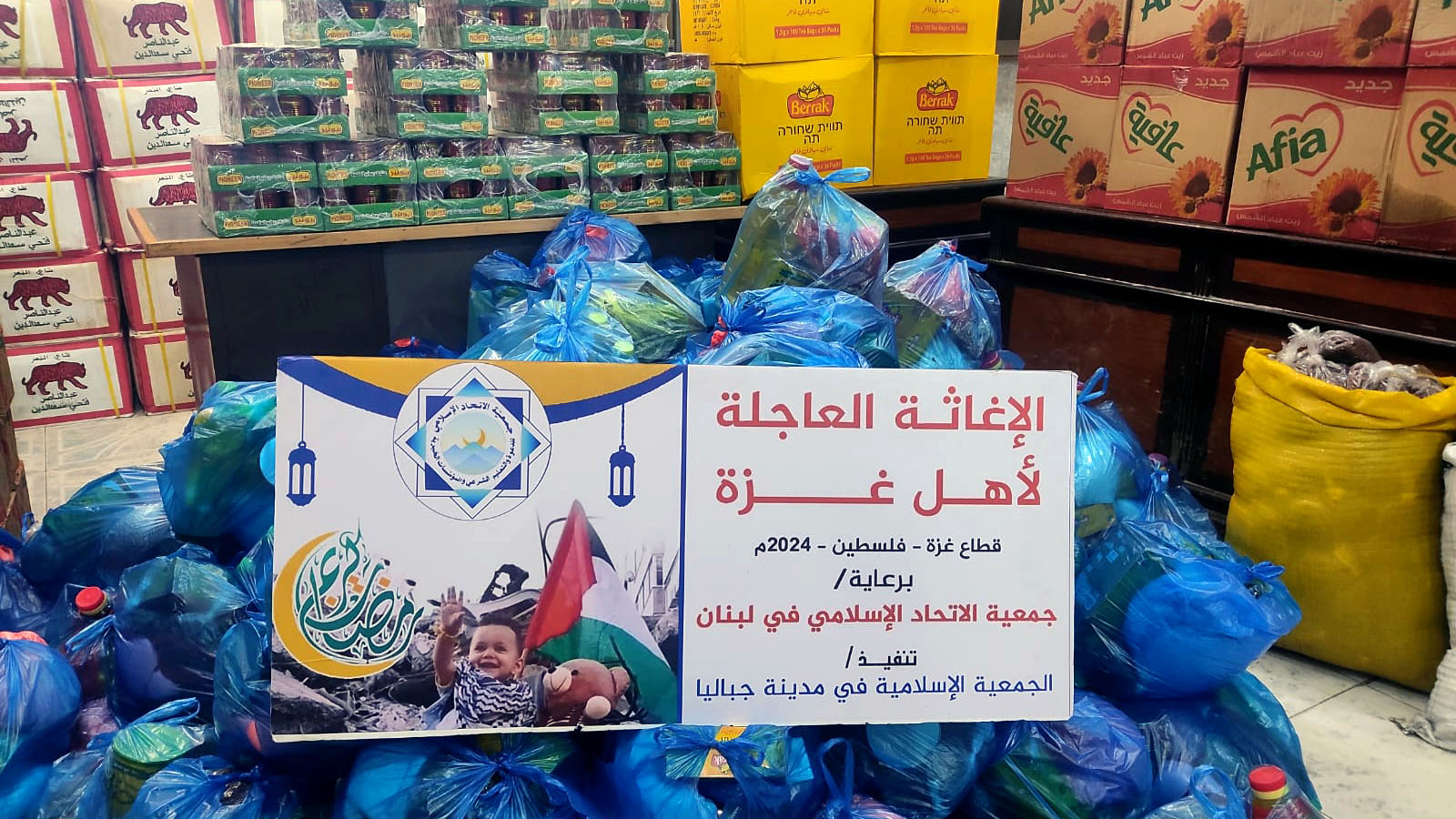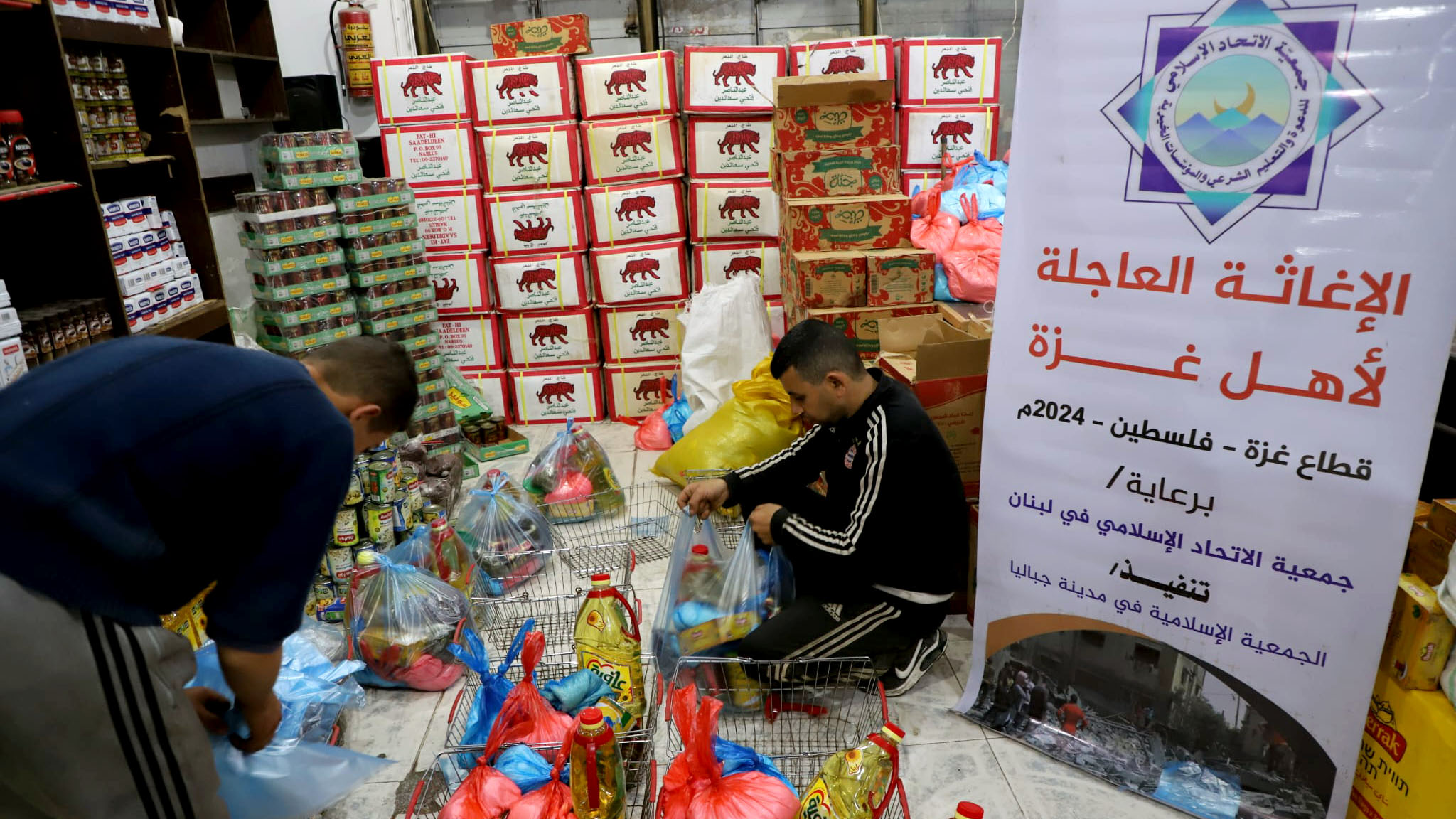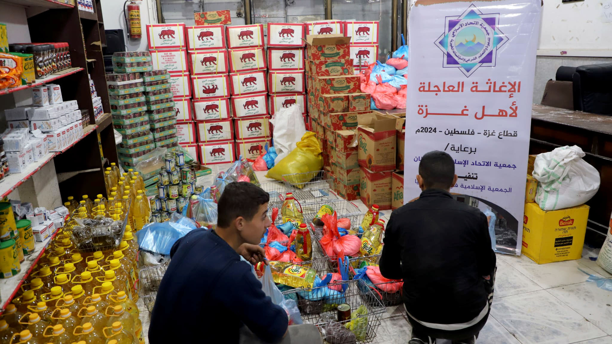 جانب من تجهيز وتوزيع المواد الغذائية في مدينة جباليا في شمال غزة، بالتعاون مع الجمعية الإسلامية في مدينة جباليا.