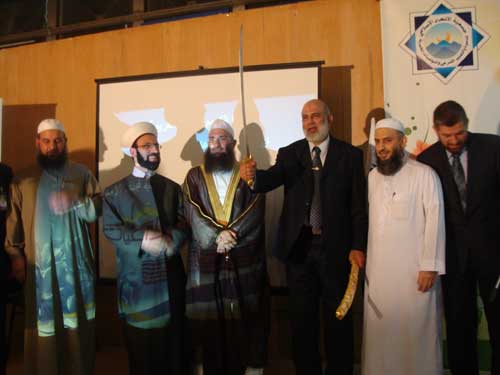 · حيّا الله أخواتي الفاضلات في مجلة منبر الداعيات. حقيقة فوجئت بهذا التكريم، وجزى الله كل خير إخواني وأحبابي في جمعية الاتحاد الإسلامي برئاسة الشيخ الحبيب حسن قاطرجي، وحقيقة لا أستحق هذا التكريم وشأني في نفسي أقلّ من هذا بكثير. الحقيقة أن الذي أثّر بي وأعجبني أن يكون التكريم عبارة عن سيف، يقول الرسول [: «بُعثت بالسيف بين يدي الساعة حتى يُعبدَ الله وحده لا شريك له، وجعل رزقي تحت ظِلِّ رمحي، وجعل الذِّلة والصَّغار على مَن خالف أمري…» رواه الإمام أحمد؛ فالسيف رمز القوة والعزّة. طبعاً هذا الأمر كان أيام زمان، أما اليوم فالطائرات والدبابات والغوّاصات. هذا تكريم لا أستحقه، أسأل الله سبحانه وتعالى أن أكون أهلاً له.