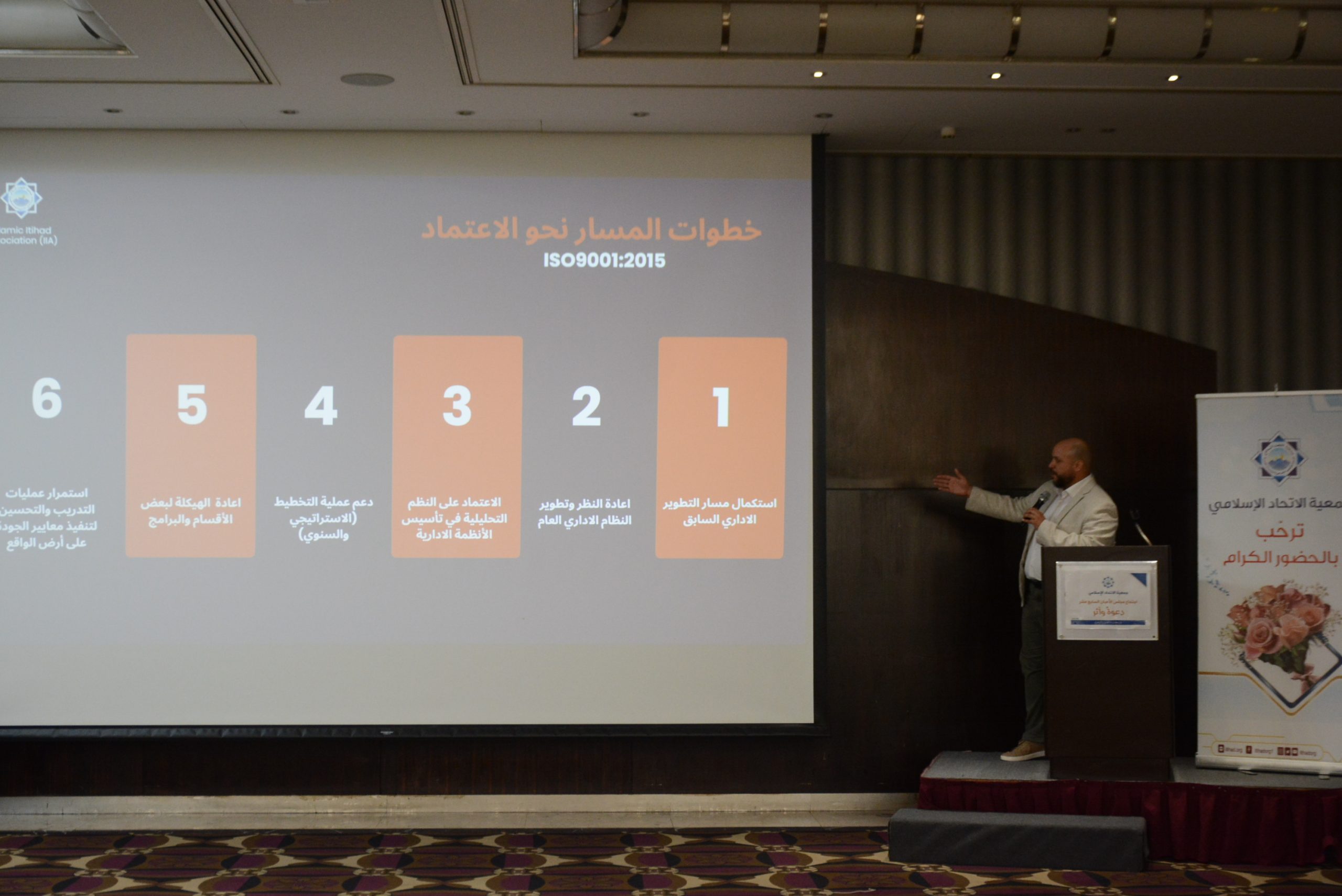 كما قُدّم عرض شامل حول مسار العمل للحصول على شهادة الأيزو، من قِبل مسؤول التطوير الإداري الأستاذ أسامة حسين آغا، إضافة إلى عرض لمسار الجودة في الجمعية قدّمه الدكتور شوقي دياب، موضحًا خطوات ضبط العمليات الداخلية ورفع كفاءة الأداء المؤسسي.