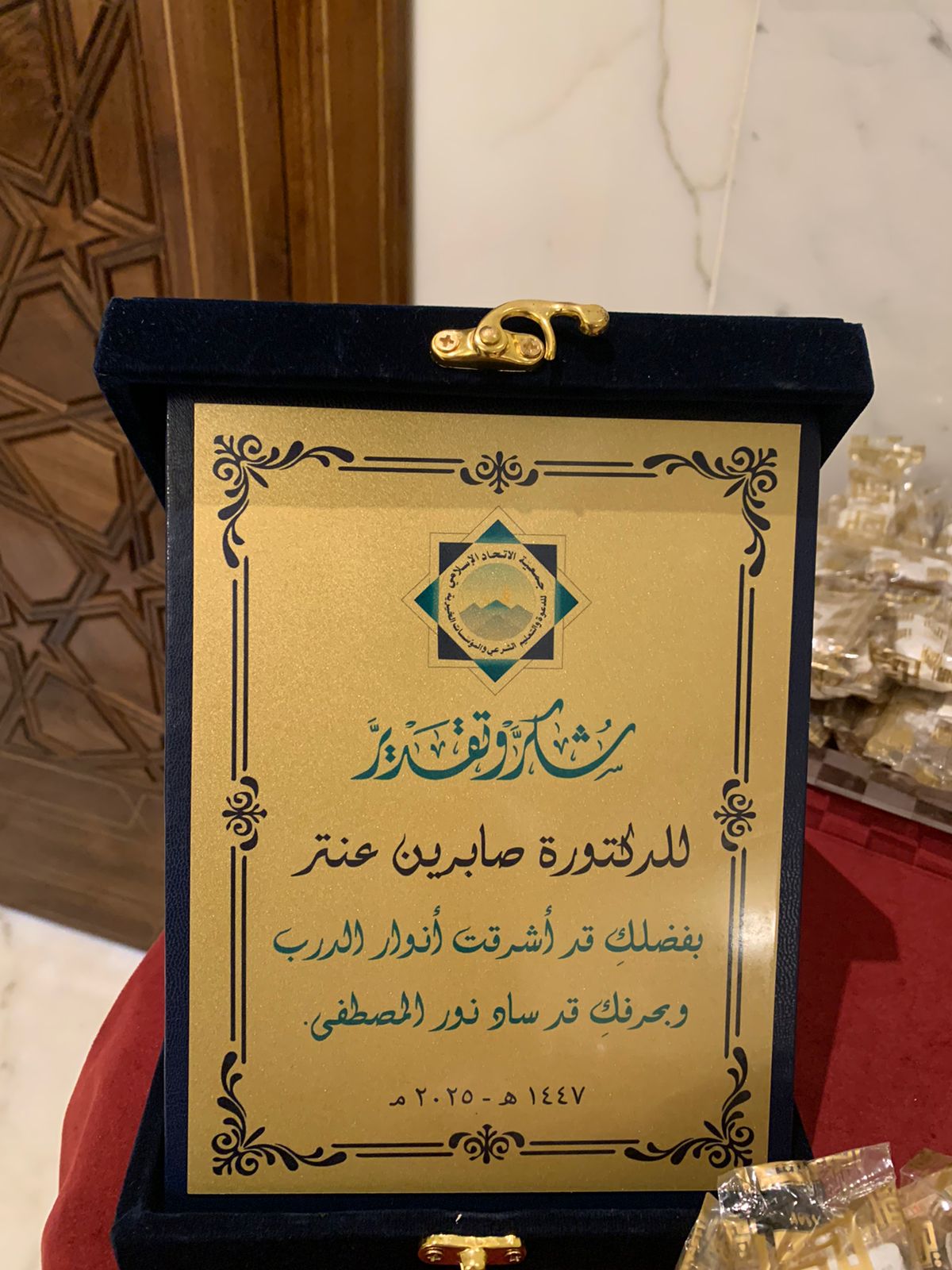 واختُتم اللقاء بتقديم درعٍ تكريمي للدكتورة صابرين عنتر بمناسبة نيلها درجة الدكتوراه، تقديرًا لمسيرتها العلمية.